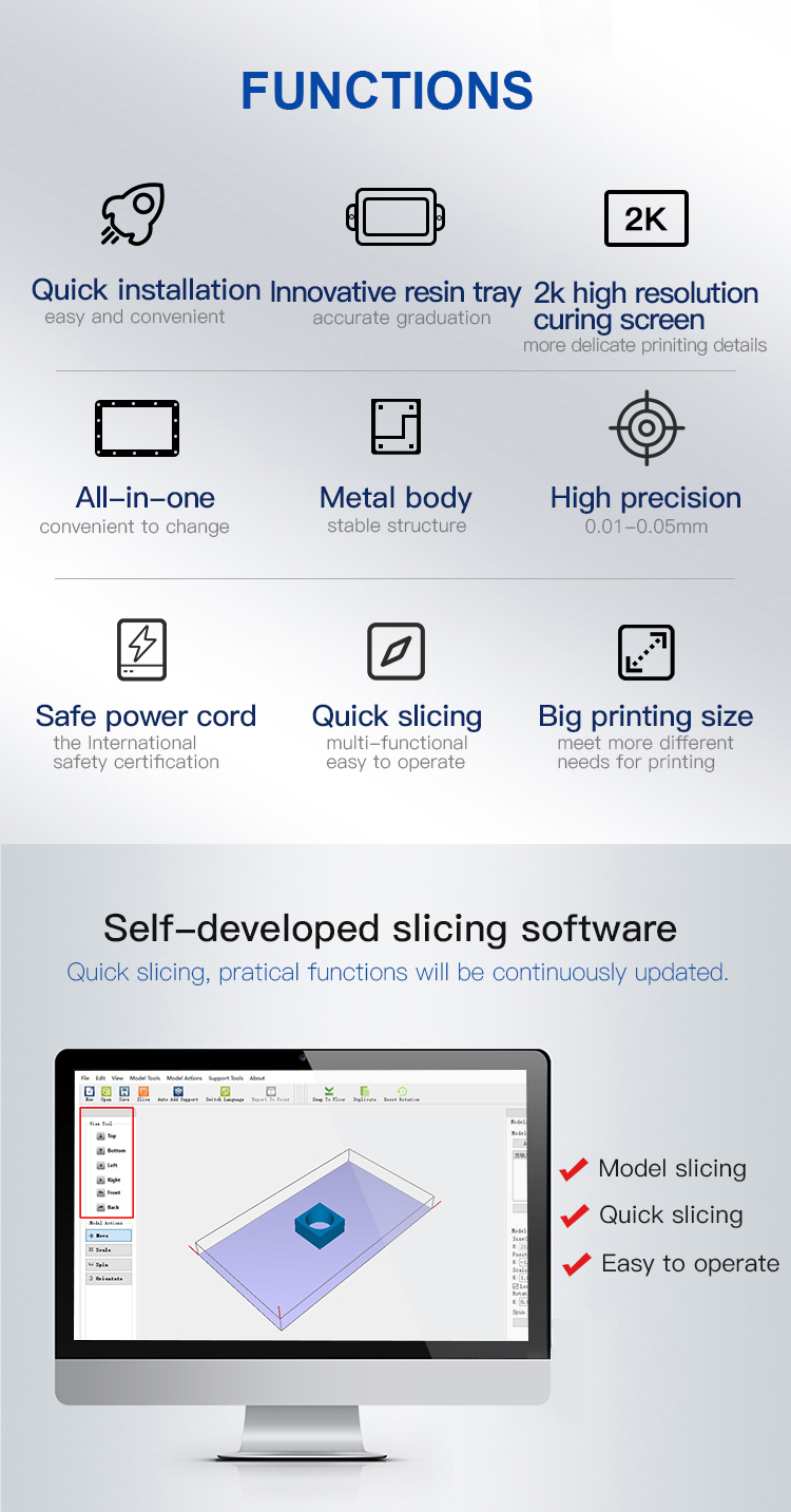 DLP 3D Printer is featured by high precision and easy to use with long life of 25000 hours. The models printed by this printer are smooth on the surface , easy to cast and high-precison.